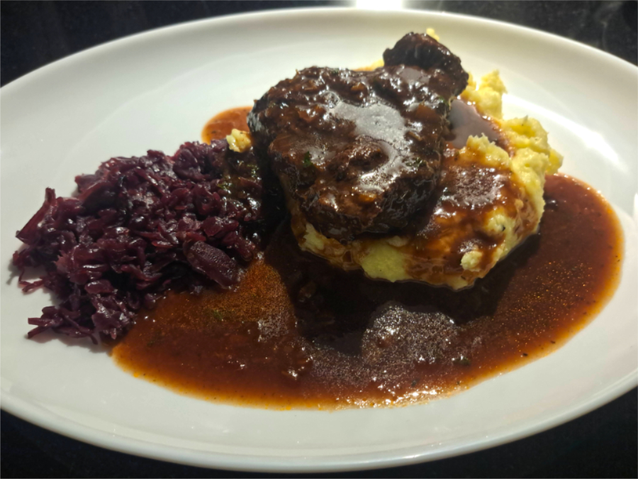 Sehr leckere, butterzarte Rinderbäckchen mit einer wunderbaren, dunklen Sauce, langsam geschmort, ein echtes “Gedicht”.